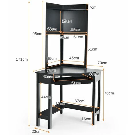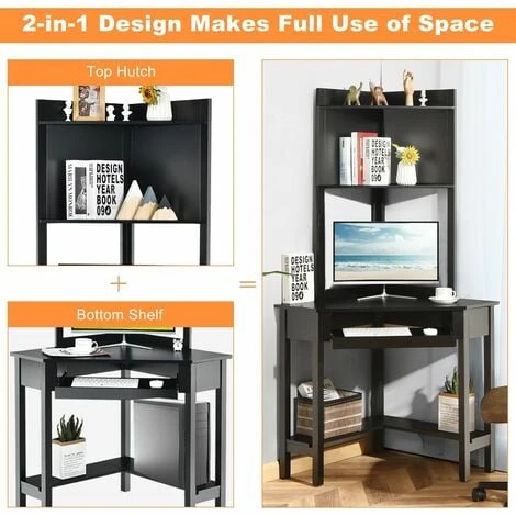 If you looking for a computer desk with lots of storage space and perfect for limited room, our corner desk implements just what you want. This corner desk is sturdy enough to hold all of your items. Attached hutch and bottom shelf offer ample storage space for home office supplies while the durable and spacious desktop provides you with optimal workspace. The unique corner design is a great solution for optimizing space and also makes your room cleaner. Simple lines and modern style perfectly decorate your home and create an efficient workspace for everyone!