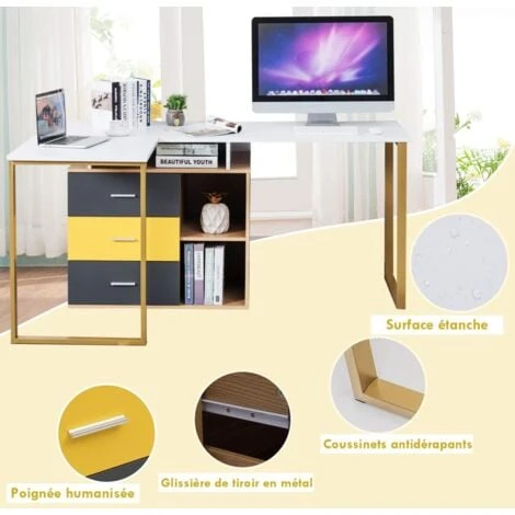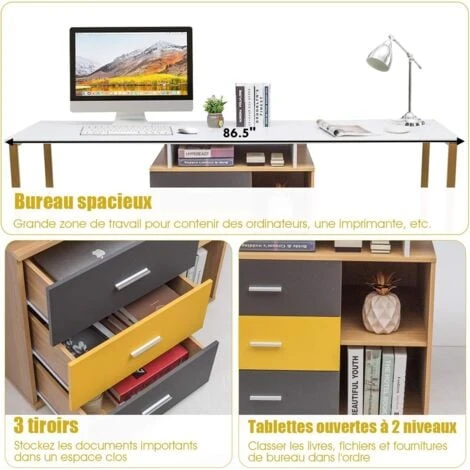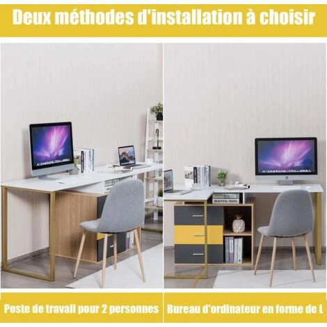 This extra-large computer desk is everything you’d expect from a two-person workstation. The spacious tabletop provides ample room for multiple monitors, laptop setups and other office supplies, making the desk an ideal workstation for 2 users. You can sit with your partner side by side to play games or do cooperation work. If you are limited in space and want to use the writing desk alone, you can install it in an L-shape to fit the room’s corner. And you can stow away books, files and decorations into the storage cabinet under the desk, which is composed of 3 large drawers and 3 open shelves. Stability is also a major feature of the computer desk, since it is designed with a sturdy steel frame and a large cabinet as support. What’s more, the computer desk is stylish in look and practical in use. It is a best choice for homes, offices and dorms. Note: Please assemble with just a Philips head screwdriver (not included), and the power tools are not recommended.