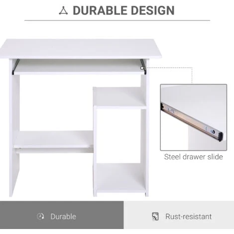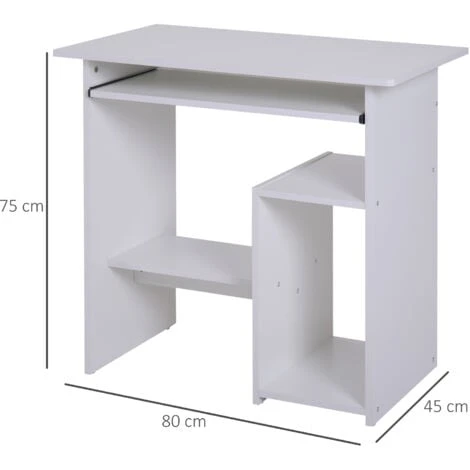 This compact computer desk is a simple but extremely useful addition for the home desk is spacious enough to carry work out peacefully. Made from thick particle board in a fresh finish, this sturdy and durable piece is crafted into a design which features a slide-out keyboard tray, CPU stand, two open storage shelves and a large worktop. Smooth on top, the non-scratch melamine surface is easy to clean and maintain, making it perfect for busy lifestyles. Specifications: