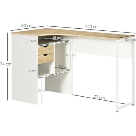 β Dimensions: 74H x 120L x 60Wcm. Desktop: 120L x 60Wcm. Drawer: 60H x 21W x 23.4Dcm. Top compartment: 10H x 54.8W x 28Dcm. Left compartment: 11H x 26.5W x 28Dcm. Right compartment: 30H x 26.7W x 28Dcm. β Weight capacity: 80kg. Desktop: 30kg. Compartments and drawers: 5kg