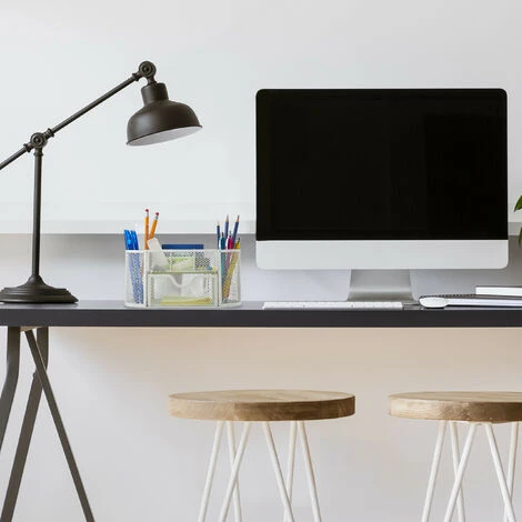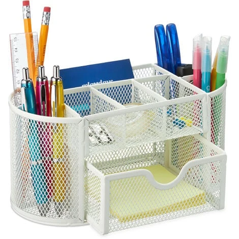 Create order on your desk with this metal office organiser. It combines the advantages of a pen holder and desk organiser in one desk organisation system for the office or home office. The desk organiser in a modern mesh design has different sized compartments for pens, brushes, letters and much more. Additional office materials such as staples or paper clips can be stored in a small pull-out drawer.